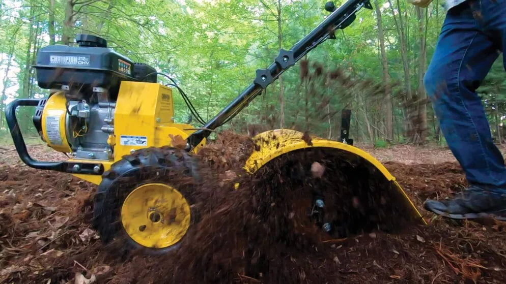 Champion’s 19-Inch Rear Tine Tiller tackles tough ground with ease. The 212cc engine powers a gear-driven transmission that’s housed in a heavy-duty cast-iron case, while the counter-rotating tines and 13-inch self-propelled agricultural tires will make breaking new ground as easy as weeding.