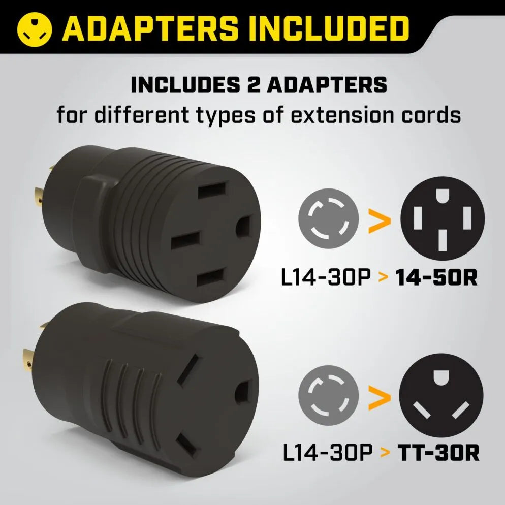 The Champion Power Distribution Box boasts a heavy-duty steel frame and a powder-coated finish that ensures durability and longevity. It features (6) six 120V GFCI-protected duplex outlets (5-20R) and (1) one 120/240V twist-lock outlet (L14-30R). Also included are 120V 30A (L14-30P X TT-30R) and 120/240V 50A (L14-30P X 14-50R) RV adapters, giving you a variety of options for your power needs. With a total of 50 amps of power, this distribution box can handle heavy loads with ease.